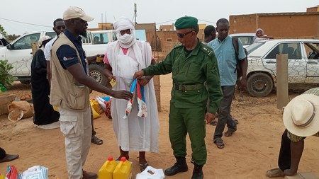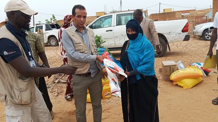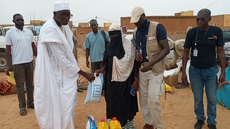322 Ménages (familles) des sinistrés de l’inondation des quartiers sont les bénéficiaires. Ces familles pauvres et victimes ont reçu (ration par ménage) : riz Mauritanie 2 sacs de 25 Kg, sucre 1sac de 10kg, huile 2 bidons de 5litres, savon PM 1carton de 48, Eau de Javel une caisse de 15, une moustiquaire imprégnée et des kits hygiènes.